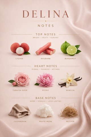 LOUISE DELINA opens with a fresh, fruity sparkle from litchi and rhubarb, giving it a slightly tart yet addictive twist. The heart blooms into a soft bouquet of Turkish rose and peony, creating a romantic and feminine aura. As it settles, creamy vanilla, soft woods, and musk leave a clean, elegant, and long-lasting trail on your skin.