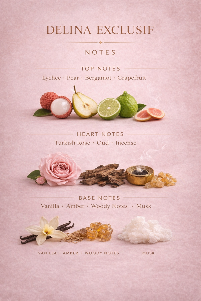 It opens with a juicy burst of litchi and pear, giving a sweet, feminine sparkle. The heart reveals a rich Turkish rose blended with incense and oud—creating a deep, romantic, and slightly mysterious aura. As it dries down, warm vanilla, amber, and musk wrap your skin in a creamy, seductive trail that lingers beautifully.