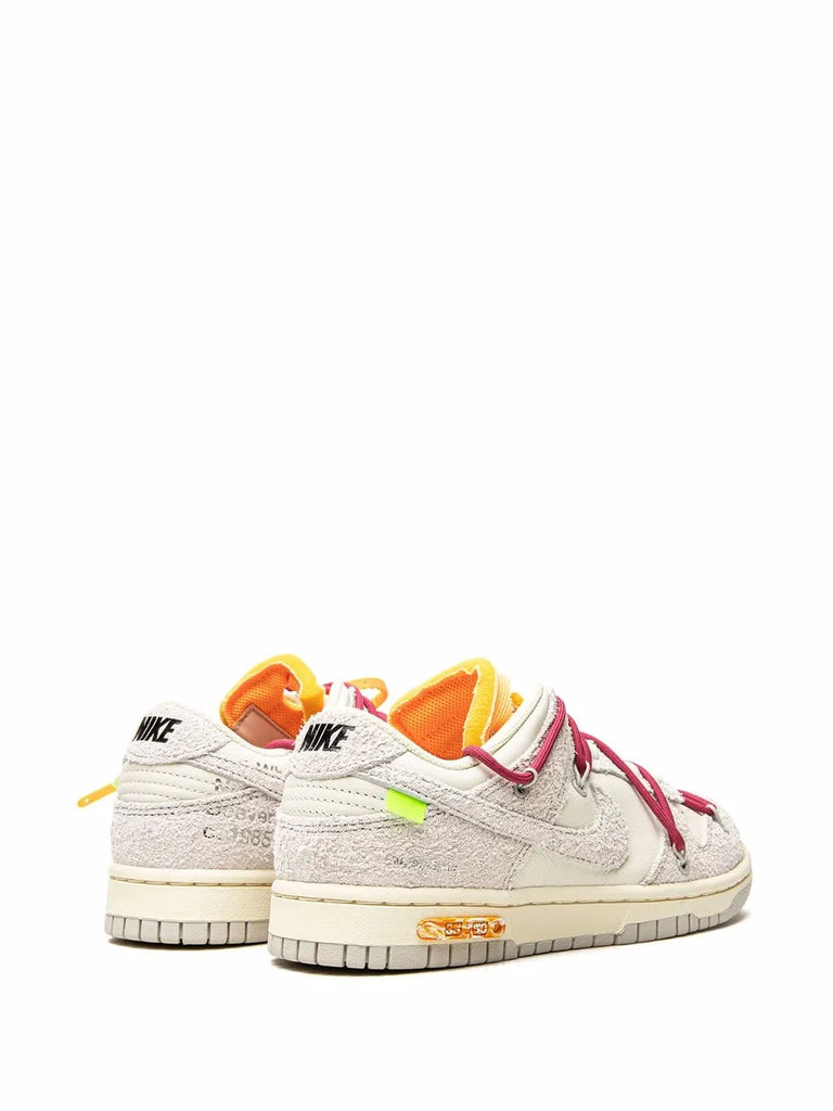 The Nike Dunk Low Lot 35 Off-White features a white leather base with light grey canvas overlays and bright purple accents on the secondary laces and zip tie. Signature Off-White text and a “35 of 50” badge complete the deconstructed look.