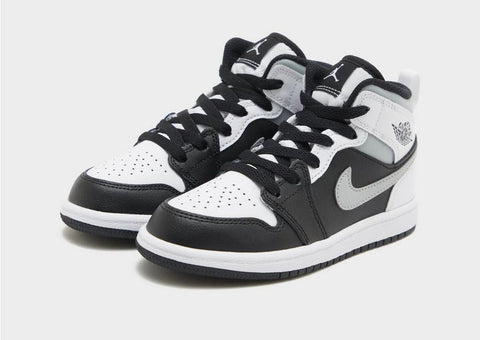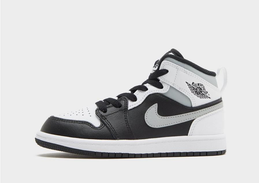 The Nike Jordan 1 Mid White Shadow features a mid-top silhouette with black leather side panels, a light smoke grey Swoosh, and crisp white on the perforated toe box, collar, and heel. Classic Jordan branding and encapsulated Air cushioning combine for retro styling, solid comfort, and everyday wearability.