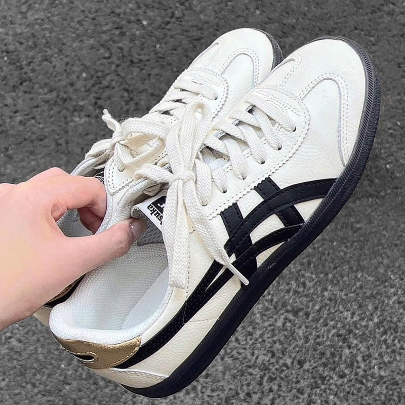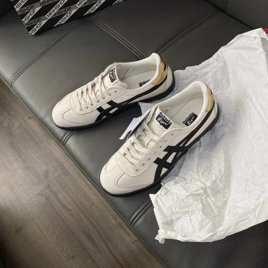 Experience the fusion of heritage and innovation with Onitsuka Tiger Tokuten 'Cream Black Gold'. These sneakers showcase a bold color scheme with premium materials. Inspired by Japanese aesthetics, the unique lines and textures create a captivating silhouette. Designed for both style and comfort, Tokuten features a cushioned footbed and durable rubber outsole. Elevate your footwear game with this must-have sneaker that embodies the essence of Onitsuka Tiger's iconic legacy.