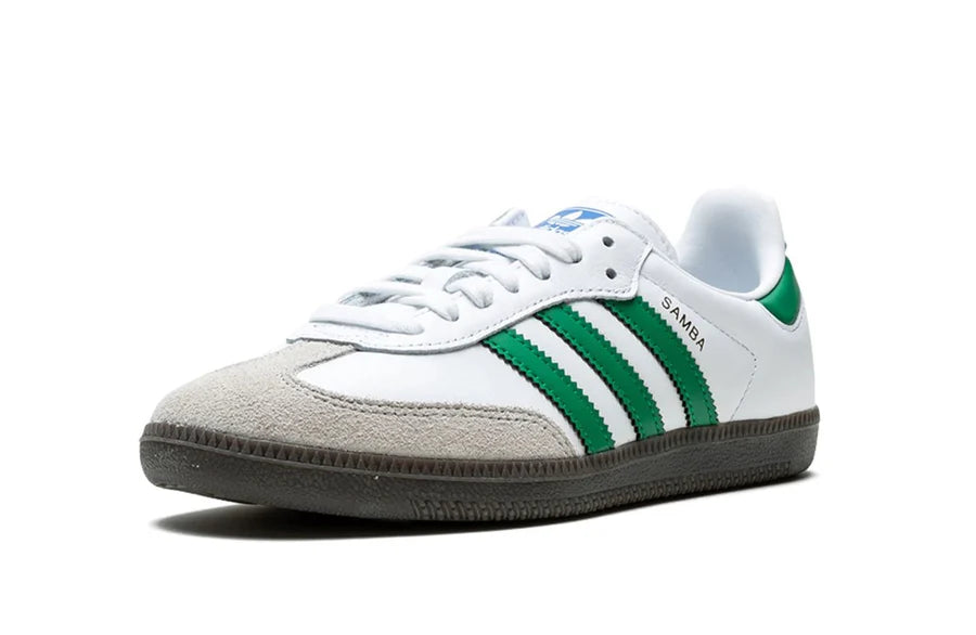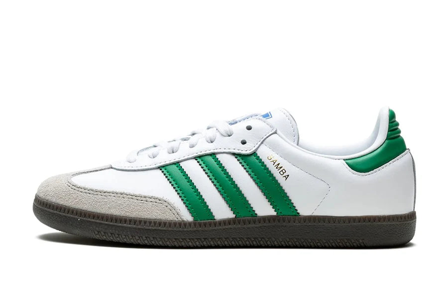 The Adidas Samba in Green brings a fresh update to the iconic silhouette with a vibrant green leather or suede upper, accented by the signature serrated 3-Stripes—often in white. Retaining classic elements like the T-toe design, gold-foil Samba branding, and gum rubber outsole, it combines bold color with timeless style.