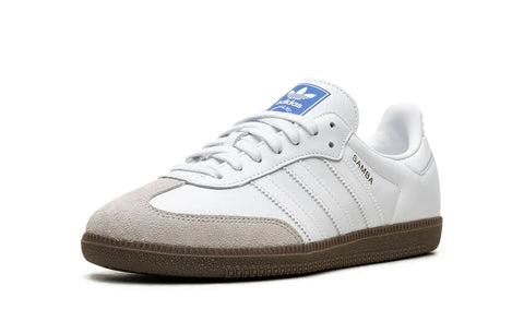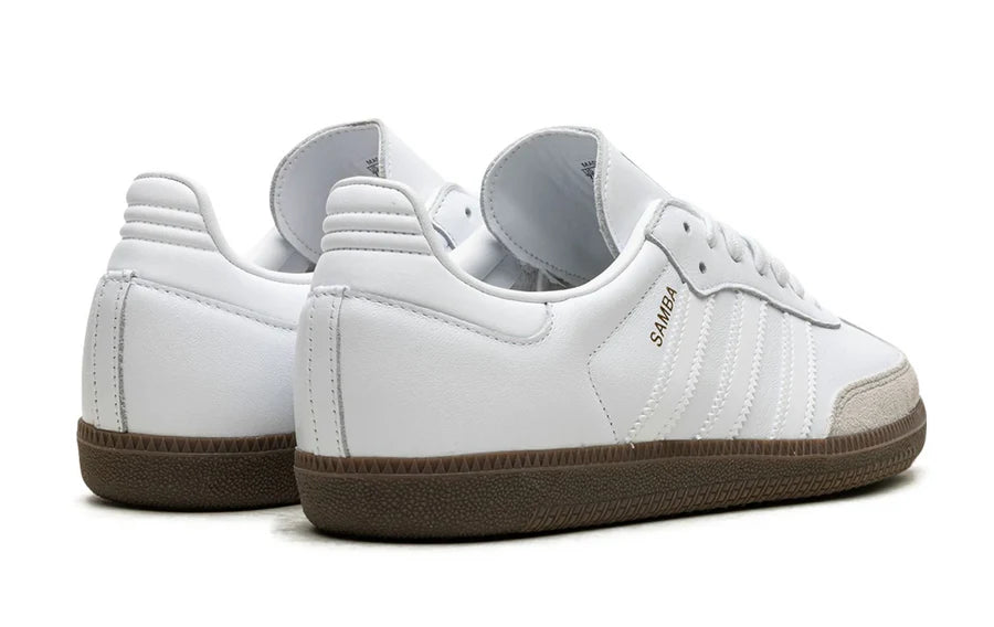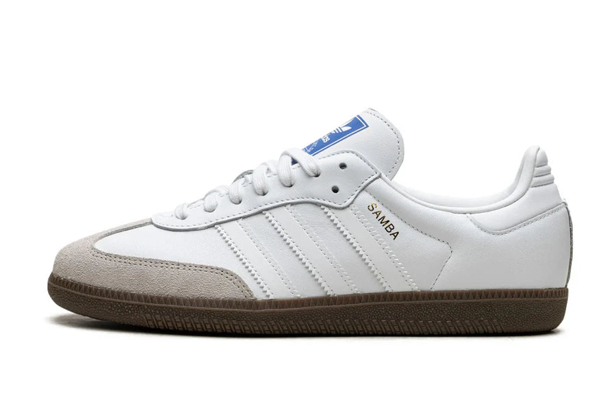 The Adidas Samba in white gum finishes off the classic silhouette with a clean white leather upper and suede overlays, anchored by the iconic serrated 3‑Stripes. It's complete with the signature T‑toe design, gold‑foil "Samba" branding, and a traditional gum rubber outsole—offering a timeless look that blends heritage style with everyday flair.