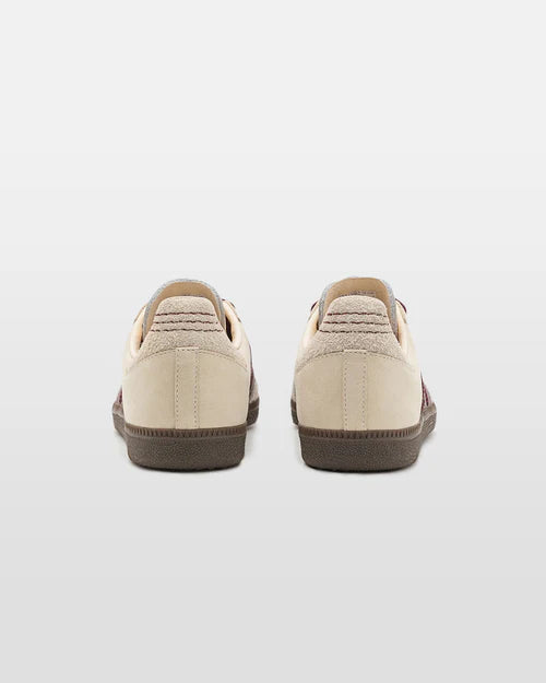 The Adidas Samba Wonder White Maroon gives the timeless Samba silhouette a refreshed, color-pop twist. It features a crisp white leather upper complemented by rich maroon suede overlays and serrated 3‑Stripes. Classic elements like the T‑toe design, gold‑foil "Samba" branding, and a traditional gum rubber outsole are all intact—balancing heritage charm with a bold, modern flair.