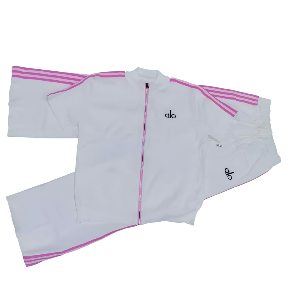 The Alo Tracksuit White Pink Stripes features a crisp white zip-up jacket and coordinating joggers accented with soft pink stripe detailing along the sleeves and pant legs. The jacket has a relaxed fit, full-length zipper, and ribbed cuffs and hem for polished comfort. The pants offer a tapered-leg silhouette, elastic waistband, and side stripes that connect the look with sporty elegance. Crafted from breathable performance fabric, this set blends clean styling with all-day functionality.