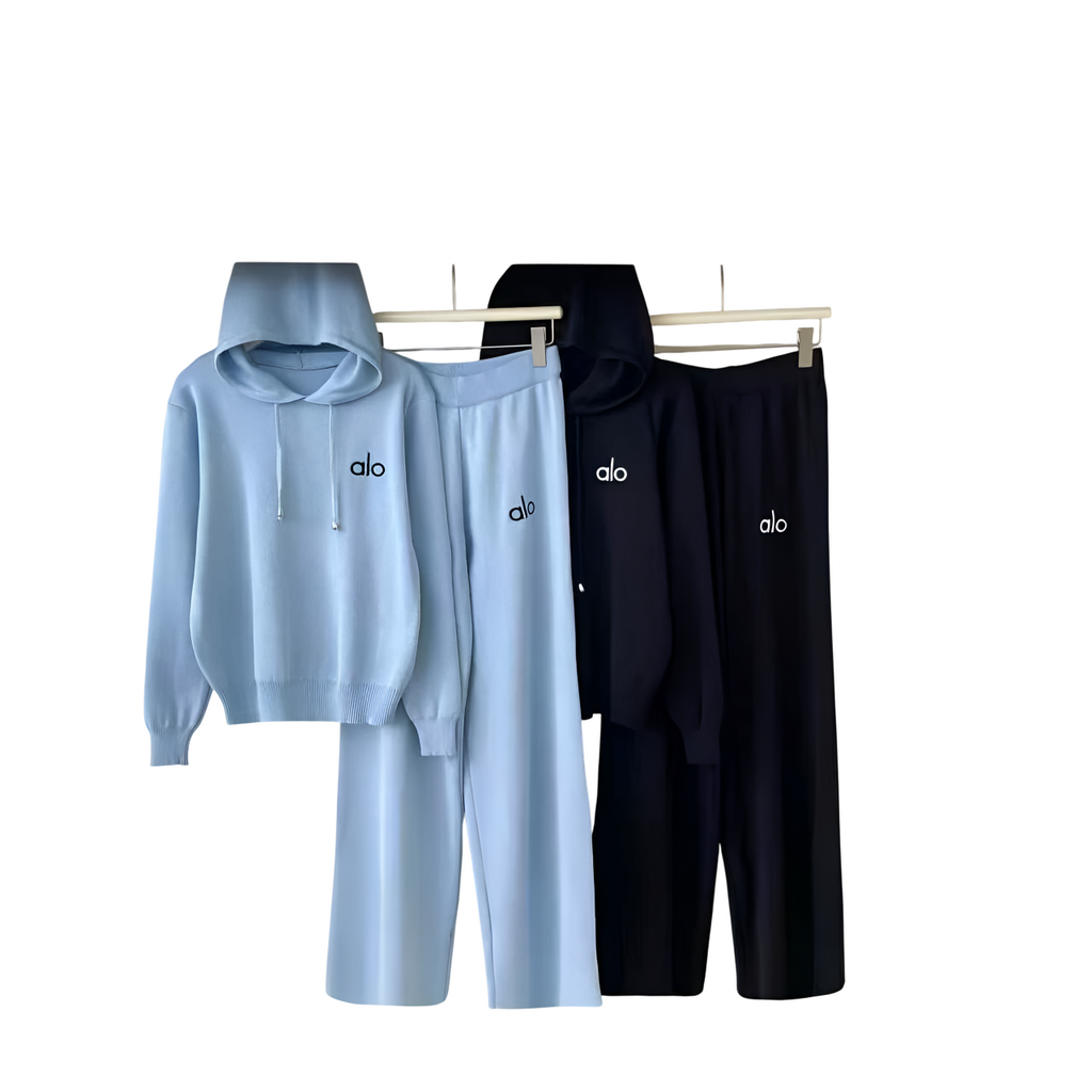 The Alo Yoga Hoodie Sweatpants Set (Blue and Black) features a relaxed-fit hoodie paired with matching jogger pants, crafted from ultra-soft fleece for elevated comfort. With deep blue and classic black options, this set brings both boldness and versatility to your off-duty wardrobe—perfect for streetwear or lounging alike.