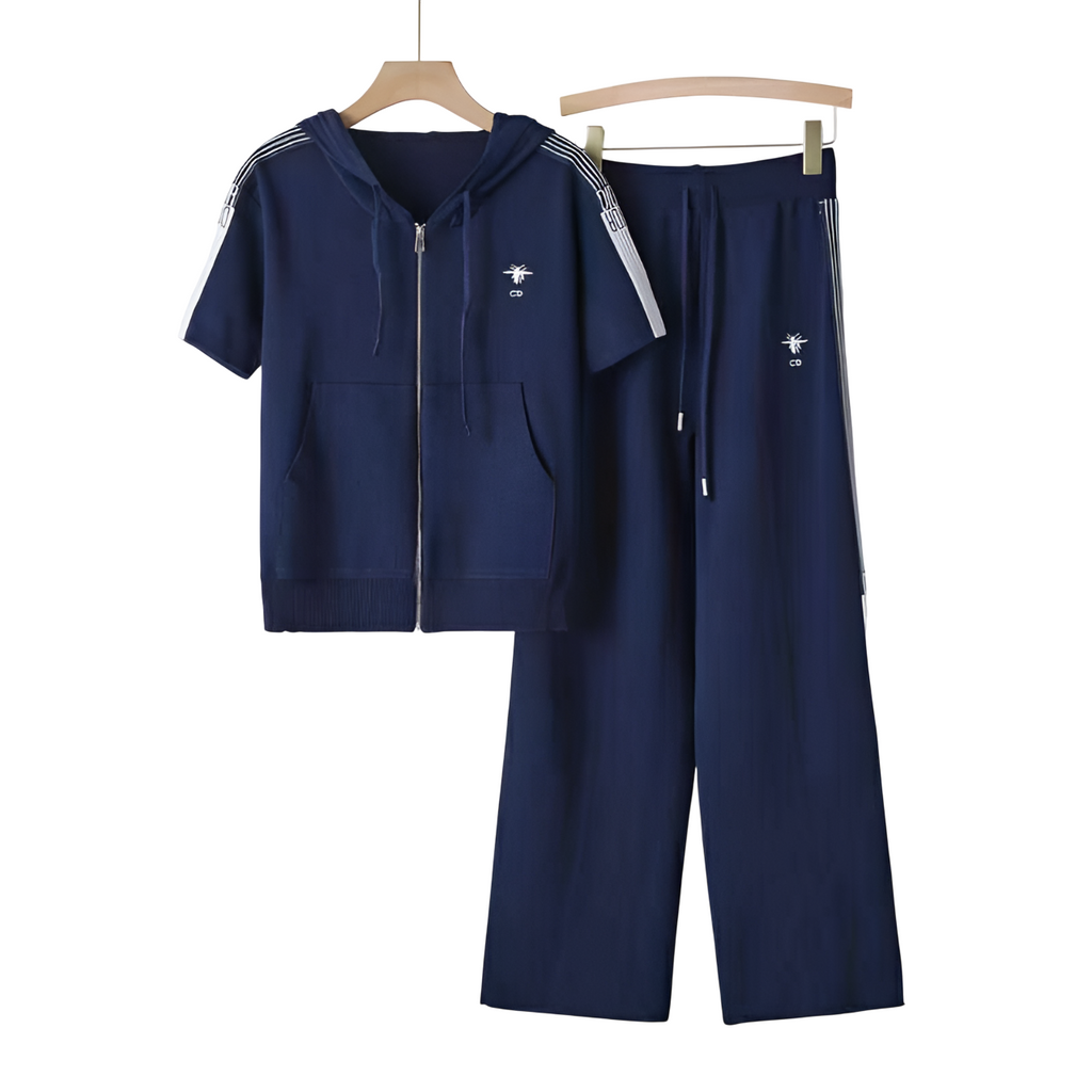 The CD Tracksuit Navy Blue White Stripes features a navy blue zip-up jacket and matching joggers, both accented with crisp white stripe detailing along the sleeves and pant legs. The jacket offers a relaxed yet tailored fit with a full-length zipper and ribbed cuffs and hem for refined comfort. The pants include a tapered-leg silhouette, elastic waistband, and side stripes that echo the sporty motif. Crafted from soft, breathable fabric, this set combines minimalist style with everyday versatility.